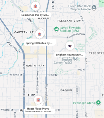 All-suite hotel; very close to the north end of campus. - SpringHill Suites by Marriott, 1580 N Freedom Blvd, Provo, UT 84604